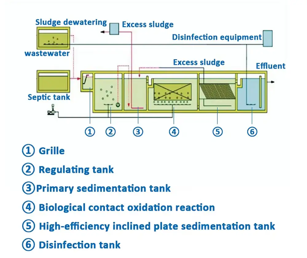 Modular Integration: All treatment units (grille, regulating tank, biological reactor, sedimentation tank, disinfection tank) are integrated into a single module, reducing pipeline connections and on-site installation work.